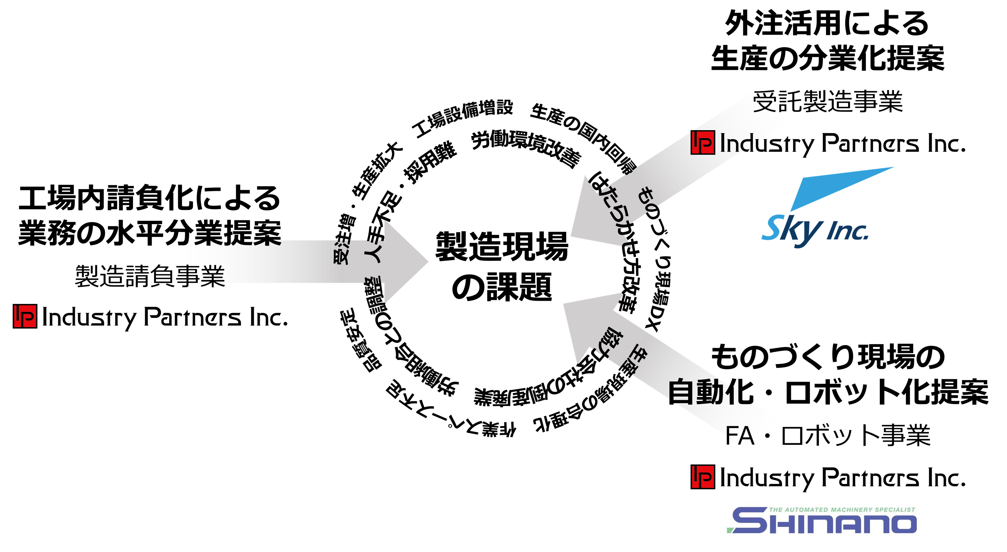 私たちインダストリーパートナーズは、お客様の生産活動の一部を分業する製造請負や受託製造、産業用ロボットを活用した自動化システムなどを提供しております。